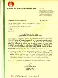 But to dismay of the civil rights group,the anti- graft agency turn deaf hear after the group leadership had written the statement at the Zonal office of the agency in Ibadan,the Oyo State Capital to adopt the petition for beginning of the prosecution of Aregbesola over the alleged financial crime totalling over N600 billion.